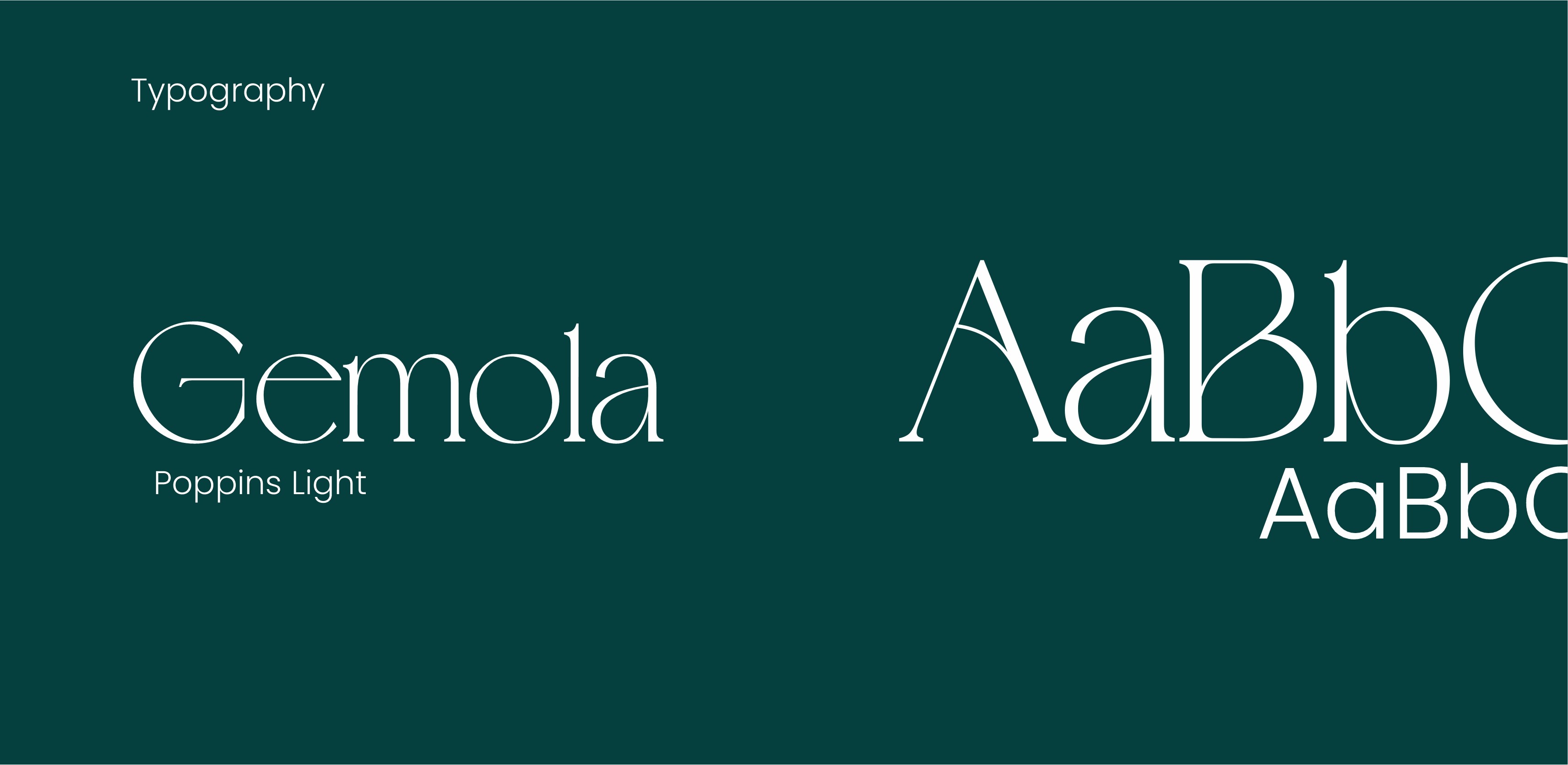 For typography, the brand utilizes "Gemola" for primary headings or display, offering a distinctive and elegant touch, complemented by "Poppins Light" for readability in body text.