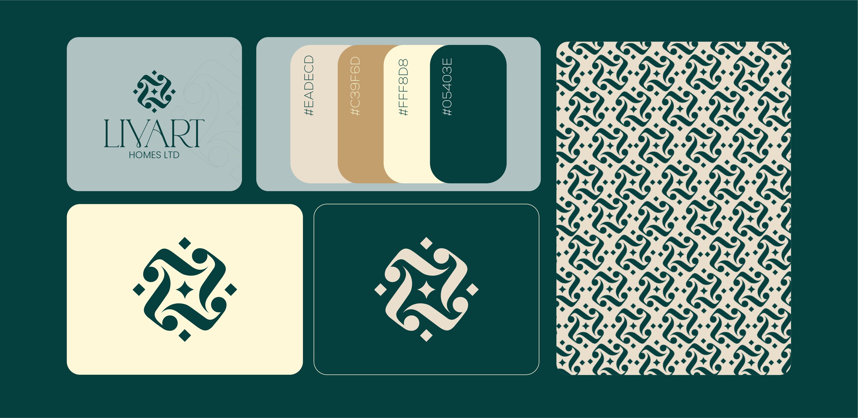 To ensure a consistent and luxurious brand presence, "LIVART HOMES LTD" employs a comprehensive suite of assets. These include various logo presentations, such as the emblem on its own and combined with the full "LIVART HOMES LTD" wordmark, presented on different background colors from the palette. A key asset is the repeating pattern derived from the logo's intricate design, which can be used for textures, backgrounds, or print materials, reinforcing the brand's unique visual identity and commitment to detail in home design.