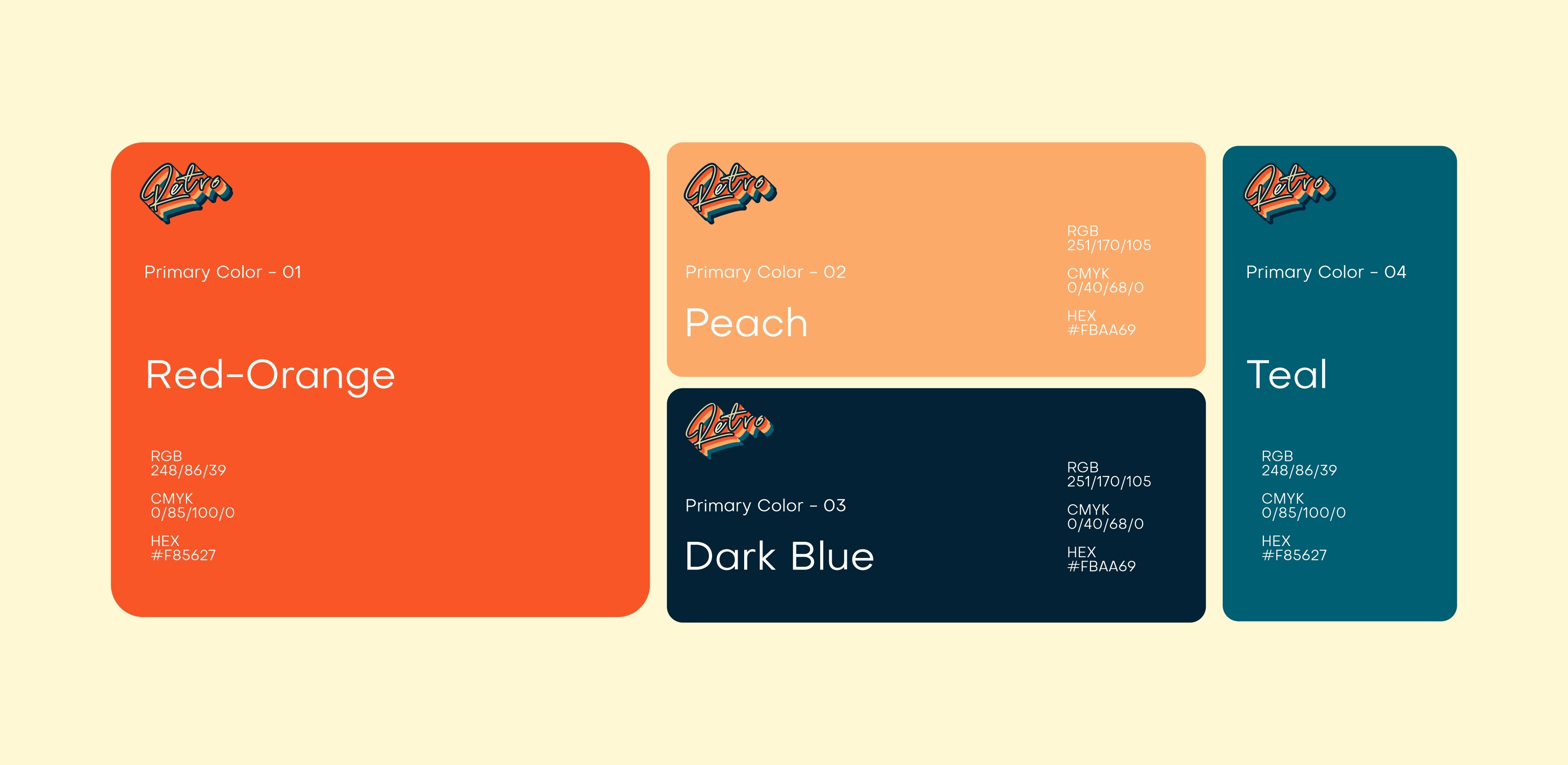 The "Retro Stores" brand utilizes a distinctive color palette that reinforces its vintage yet lively personality. Key colors include Red-Orange (#F85627), Peach (#FBAA69), Dark Blue (implied from visuals), and Teal (implied from visuals). This combination creates a warm, inviting, and visually striking impression.