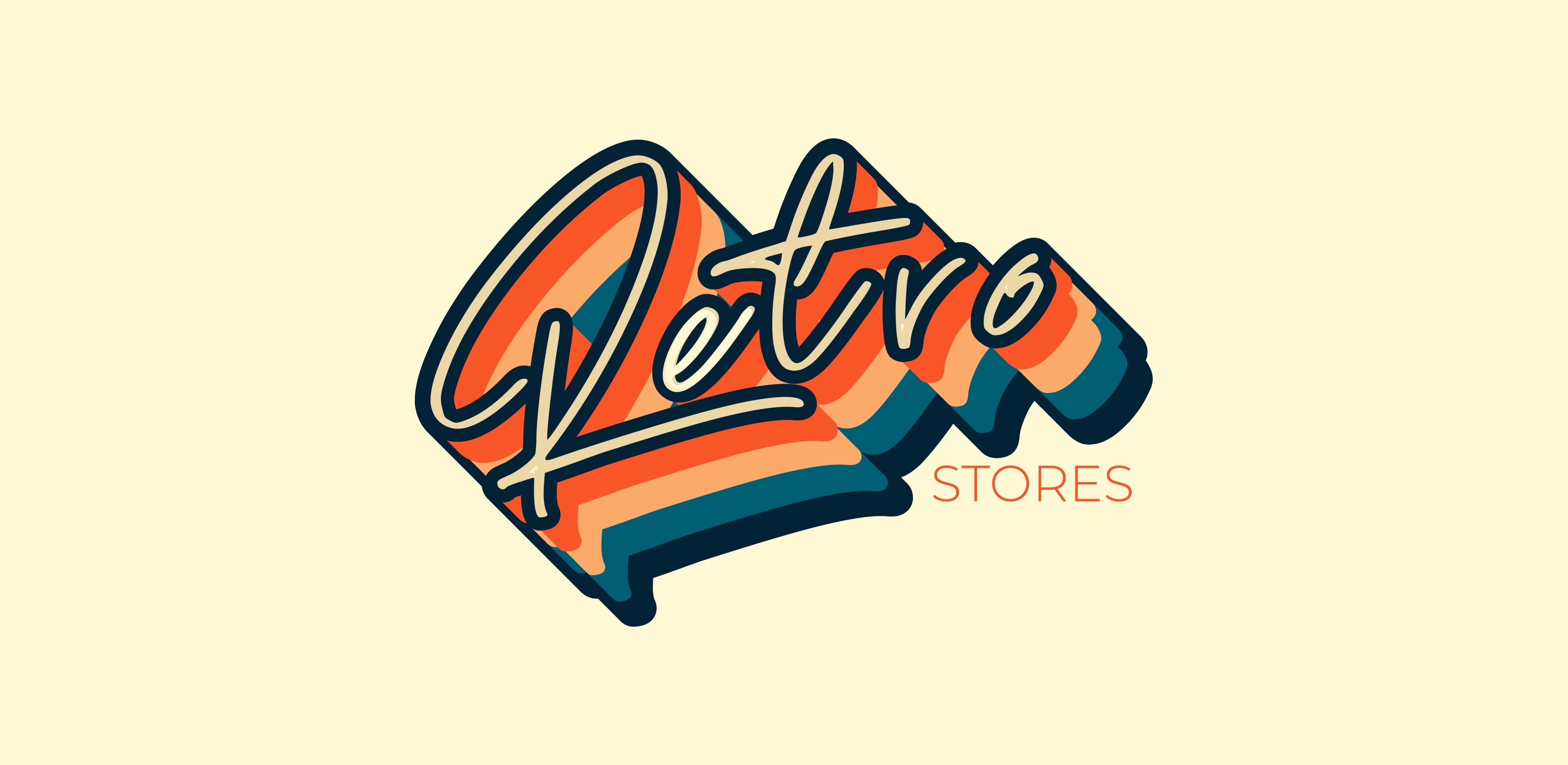 The "Retro Stores" logo embodies a vibrant, nostalgic essence, designed to evoke a sense of classic charm and playful energy. The wordmark "Retro" is rendered in a distinctive script font with a multi-layered, striped effect, reminiscent of 70s aesthetics. This dynamic design immediately communicates the brand's unique appeal and commitment to a memorable, vintage-inspired shopping experience.